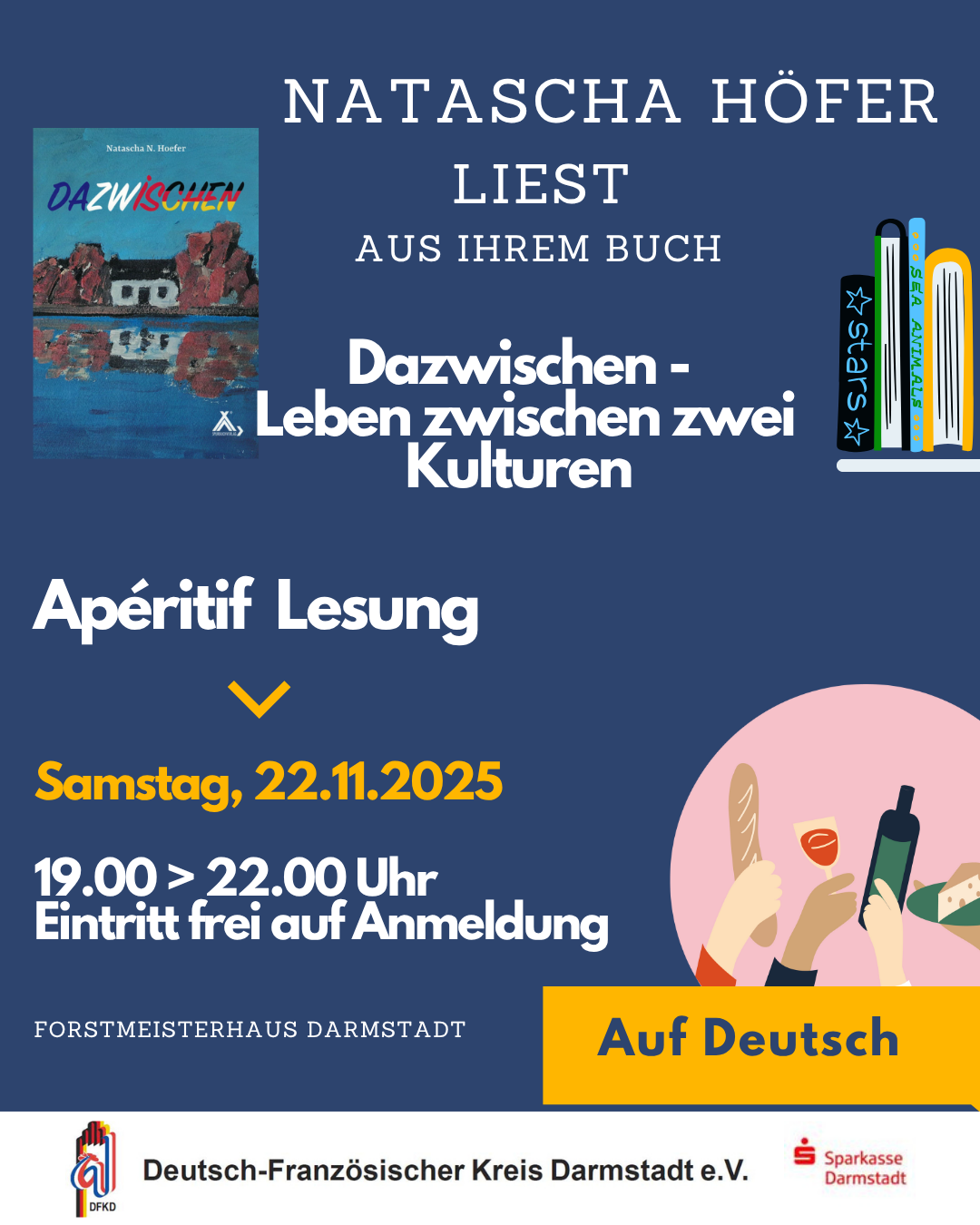 22 Novembre 19.00- 22.00: Aperitif et Lecture en allemand par l’autrice Natacha Höfer “ Leben zwischen zwei Kulturen“, Forstmeisterhaus, Darmstadt.